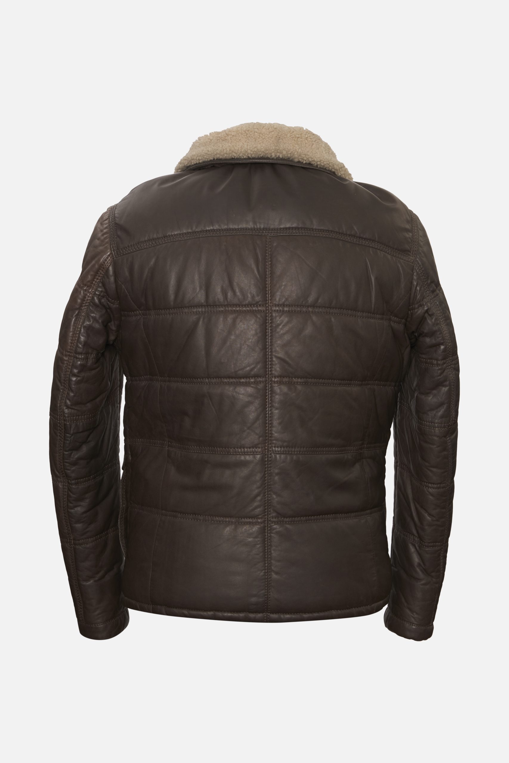 A rugged yet stylish winter essential, this dark brown leather jacket combines durability with warmth. Featuring a cozy shearling-lined collar and a quilted design, it offers both comfort and sophistication for cold weather wear.