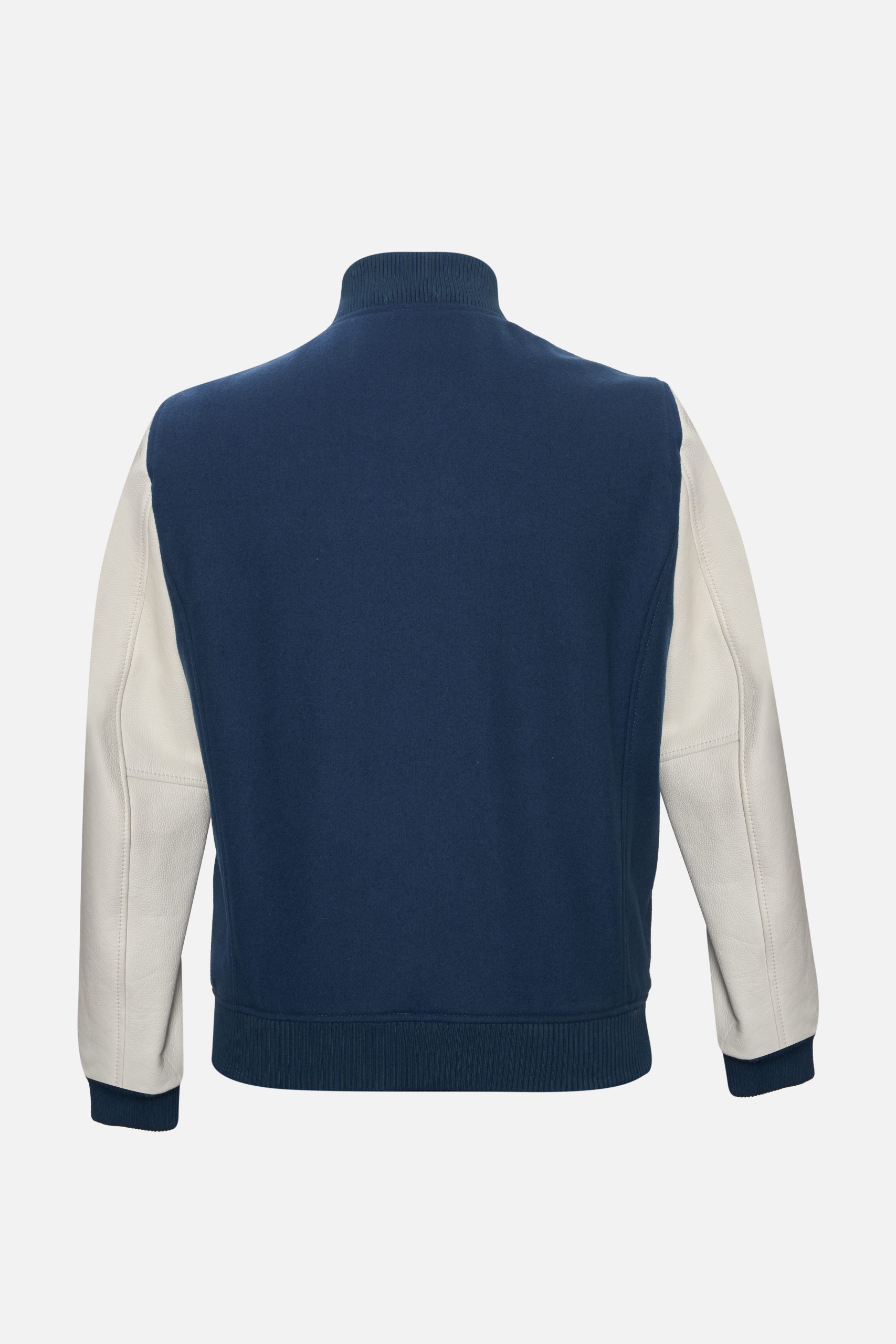Inspired by classic American varsity fashion, the Redskins varsity jacket features a navy wool body paired with off-white leather sleeves. This timeless unisex piece is designed for comfort and style, with contrast ribbed trims and an embroidered “R” letterman patch, making it a standout addition to any wardrobe.